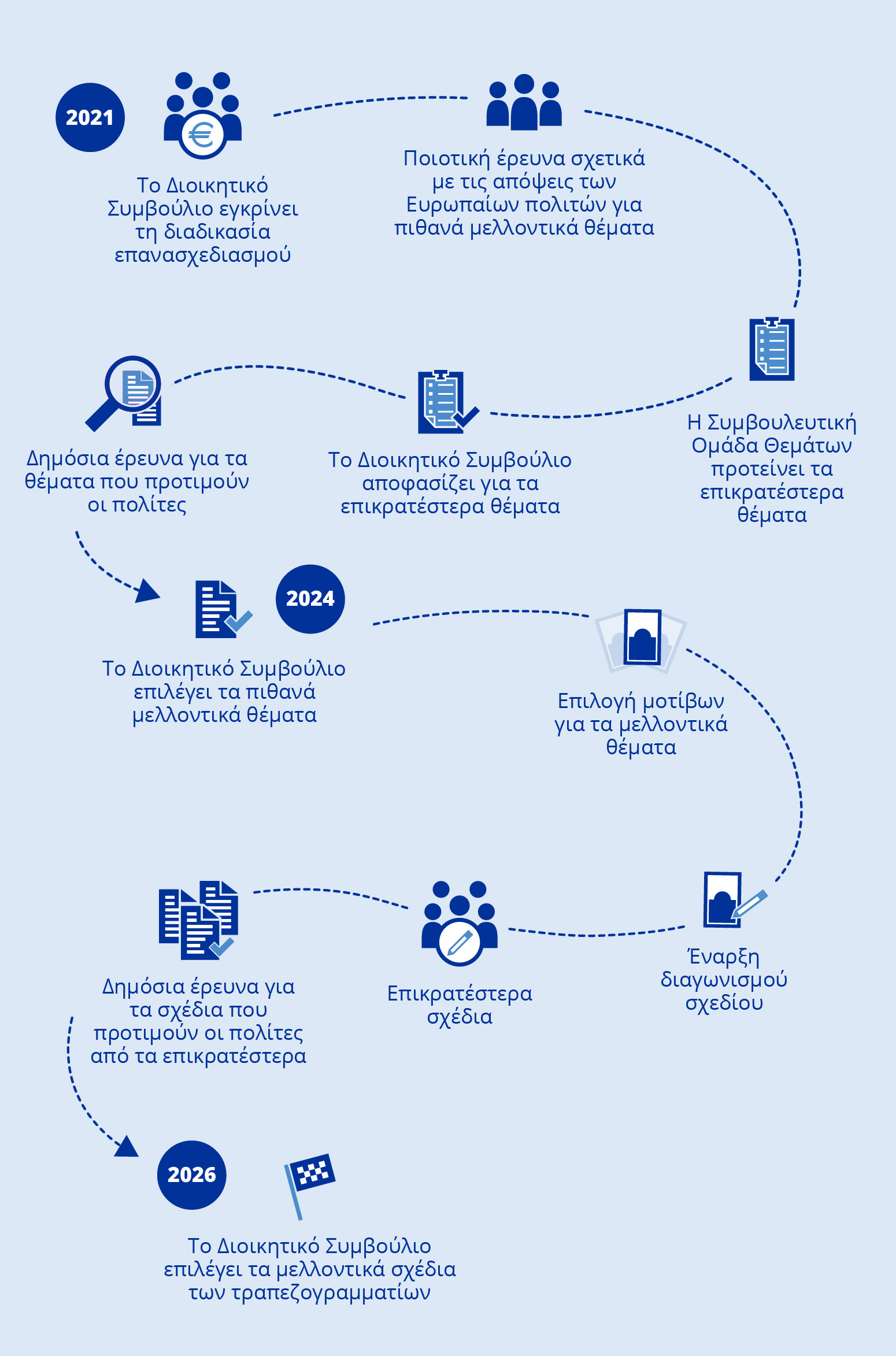 Η απόφαση του Διοικητικού Συμβουλίου σχετικά με το νέο θέμα και τα νέα σχέδια θα λάβει υπόψη τις απόψεις που θα συγκεντρωθούν από το κοινό στο πλαίσιο ερευνών και συμβουλές από ομάδες εμπειρογνωμόνων. Σκοπός μας είναι να διασφαλίσουμε ότι το θέμα και τα σχέδια που θα επιλεγούν θα είναι οικεία σε όλους τους Ευρωπαίους.