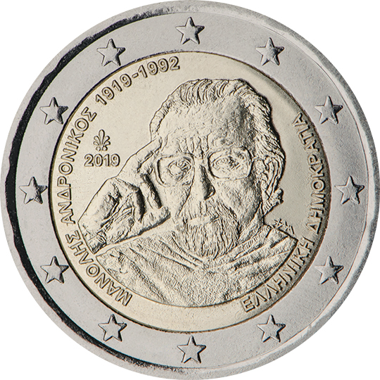 Description: Manolis Andronicos (1919-1992) was one of Greece’s greatest archaeologists. His discovery of the royal tombs at Vergina in 1977 brought to light exquisite finds that attest to the splendour of ancient Macedonian civilisation. The design features a portrait of Manolis Andronicos. Inscribed along the inner edge at left is the name ‘MANOLIS ANDRONICOS 1919-1992’, along with the minting year and a palmette (mintmark of the Greek Mint); inscribed along the inner edge at right is the wording ‘HELLENIC REPUBLIC’. Also visible at the right is the monogram of the artist (George Stamatopoulos). The coin’s outer ring bears the 12 stars of the European Union.