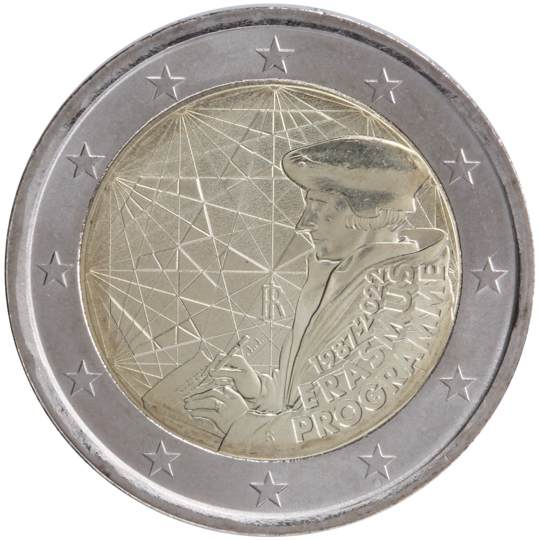 Description: The design is a mix of two major elements of the Erasmus programme: the original intellectual inspiration, Erasmus himself, and the allegory of its influence over Europe. The first one is symbolised by one of the most known depiction of Erasmus. The second one is symbolised by a beam of links going across the coin from a beacon to another, representing the numerous intellectual and human exchanges between the European students. As a reference to Europe, some of these links form other stars, born from the synergy between the countries. The figure 35, for 35th anniversary comes out from the stars in a contemporary graphical style. The coin’s outer ring bears the 12 stars of the European flag.