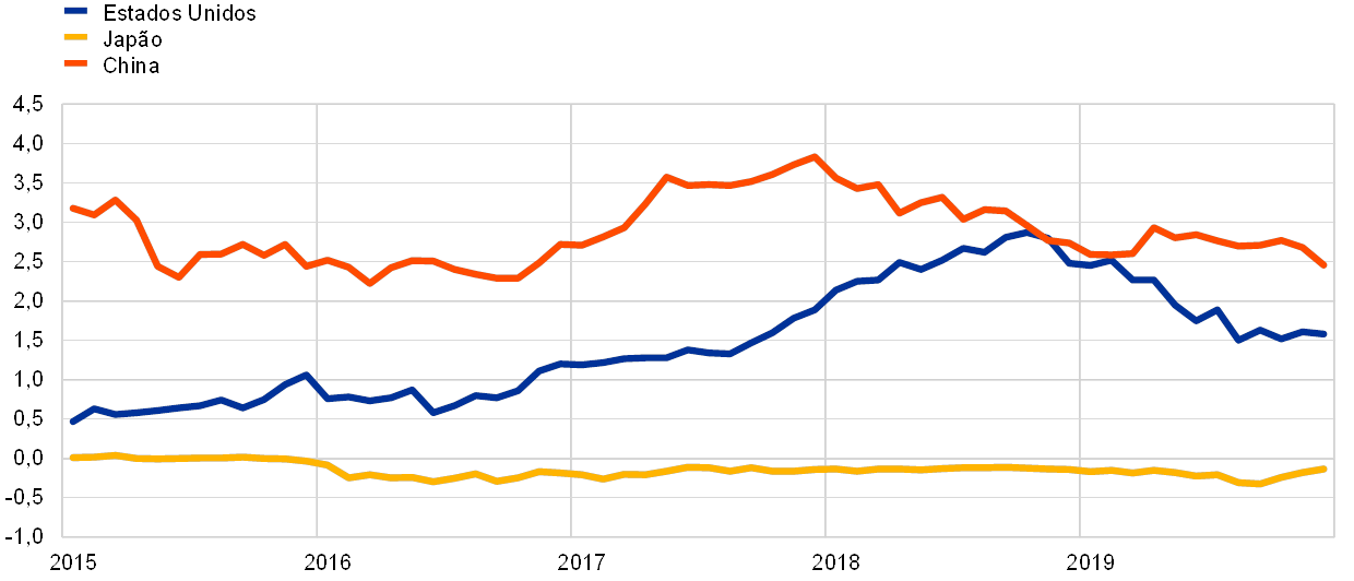 Taxas de rendibilidade das obrigações soberanas a 2 anos nos Estados Unidos, no Japão e na China