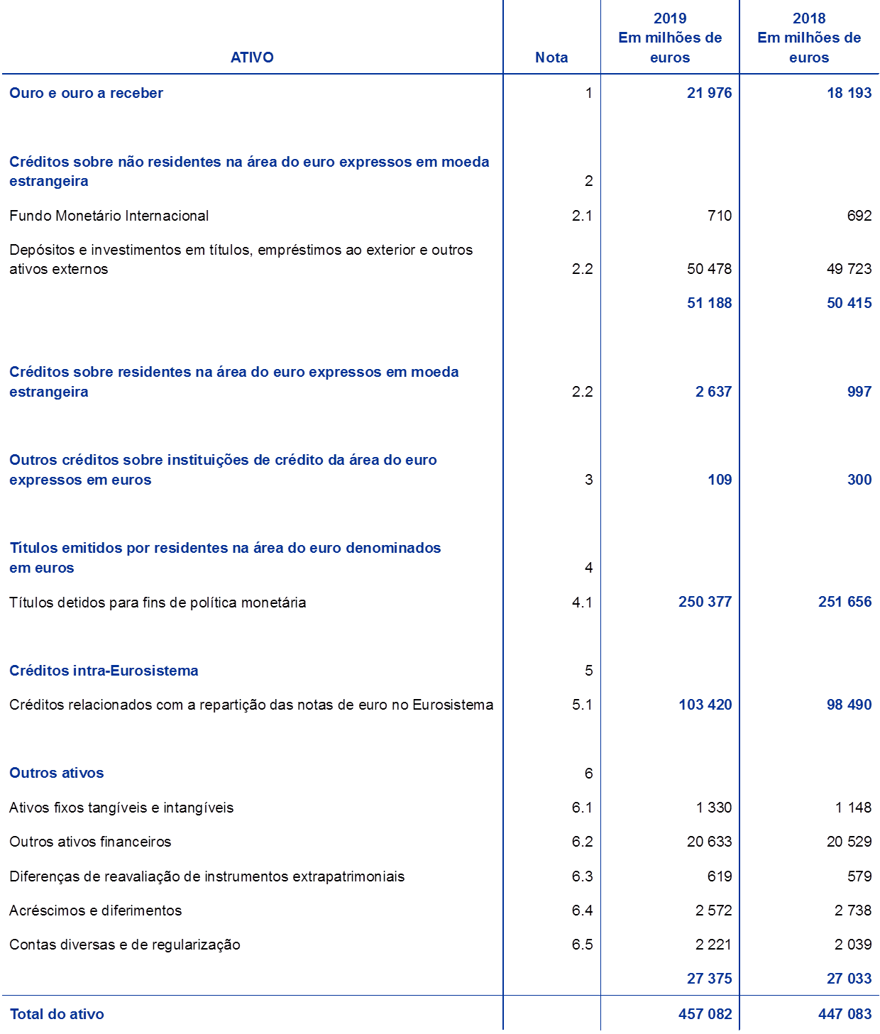 Em 2019, o total do ativo do BCE aumentou 10,0 mil milhões de euros, passando para 457,1 mil milhões de euros. Esta subida deveu‑se sobretudo i) ao aumento do valor de mercado dos ativos de reserva do BCE, em resultado da subida do preço do ouro e da apreciação do dólar dos Estados Unidos e do iene do Japão face ao euro durante o ano, e ii) ao maior montante de notas de euro em circulação[5].