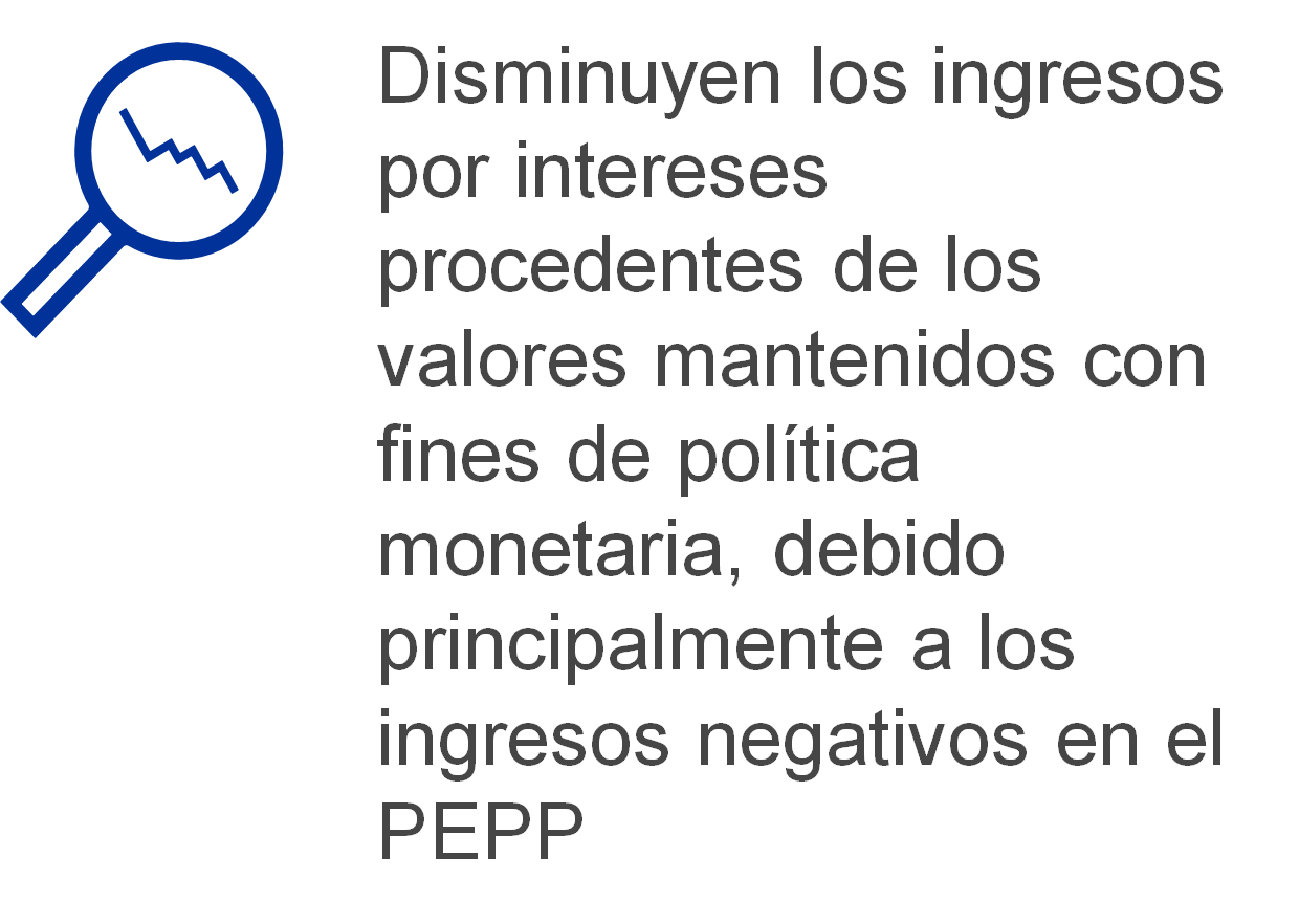 Los ingresos netos por intereses del BCE se redujeron en 451 millones, situándose en 1.566 millones de euros (véase gráfico 14), debido a la disminución de los ingresos por intereses de los valores mantenidos con fines de política monetaria y de los activos exteriores de reserva. El aumento de otros ingresos netos por intereses solo compensó parcialmente estas disminuciones.