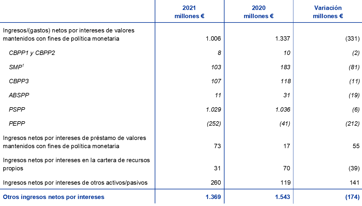 En 2021, los valores adquiridos con fines de política monetaria generaron un 64 % de los ingresos netos por intereses del BCE.