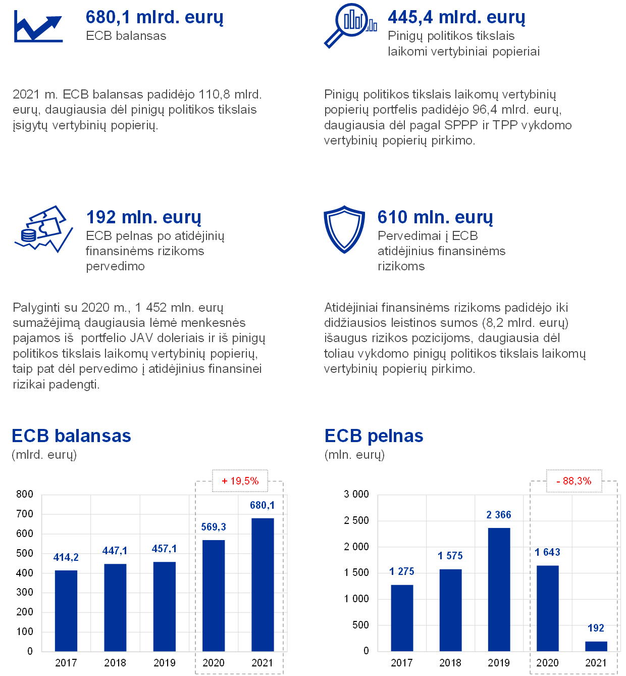 2021 m. ECB balansas padidėjo 110,8 mlrd. – iki 680,1 mlrd. eurų, daugiausia dėl pagal SPPP ir TPP įsigytų vertybinių popierių. Dėl šių pirkimų balanso straipsnio Pinigų politikais tikslais laikomi vertybiniai popieriai suma padidėjo, o dėl piniginių atsiskaitymų už minėtus pirkimus per TARGET2 sąskaitas atitinkamai padidėjo straipsnio Vidiniai Eurosistemos įsipareigojimai suma. Šį vidinių Eurosistemos įsipareigojimų padidėjimą su kaupu atsvėrė iš ne euro zonos ECB klientų TARGET2 gautų piniginių lėšų poveikis, dėl kurio padidėjo ir kiti įsipareigojimai.