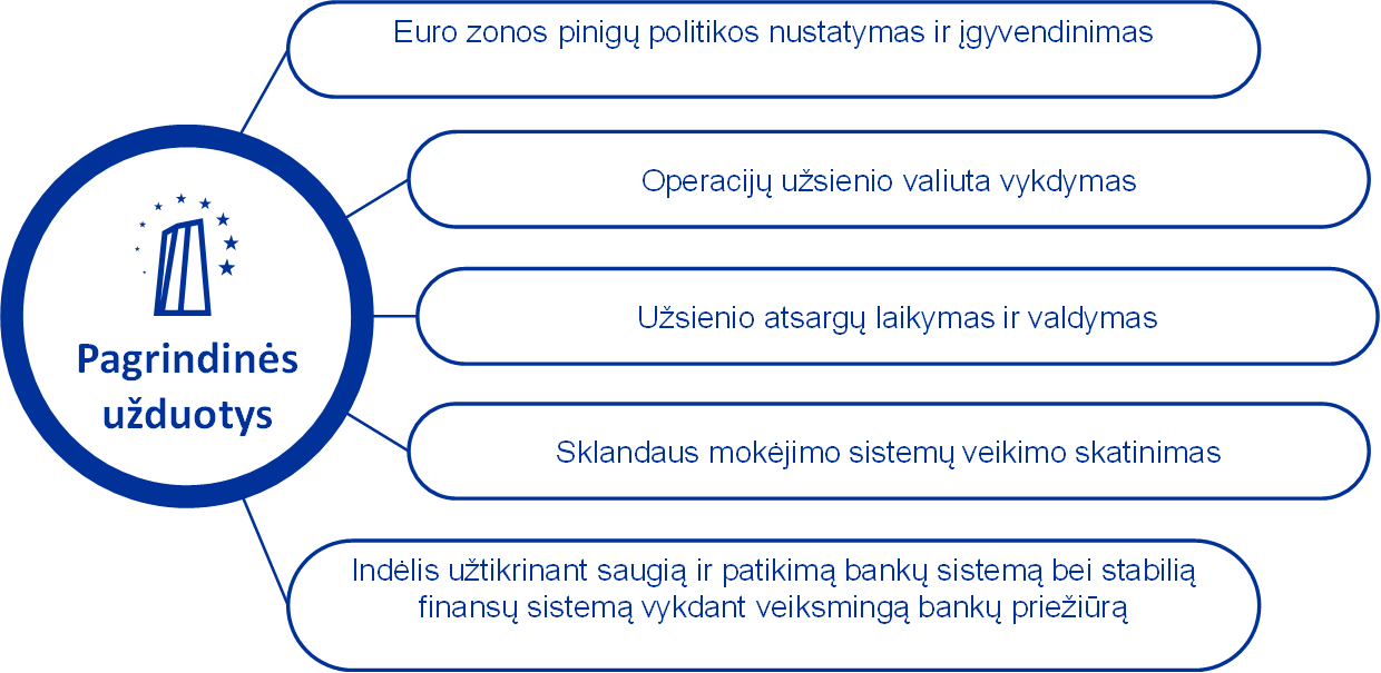 ECB yra Eurosistemos dalis. Ji taip pat apima 19-os Europos Sąjungos (ES) valstybių narių, įsivedusių eurą, nacionalinius centrinius bankus (NCB). Pagrindinis Eurosistemos tikslas – palaikyti kainų stabilumą[3]. ECB savo užduotis vykdo vadovaudamasis Sutartyje dėl Europos Sąjungos veikimo[4] bei Europos centrinių bankų sistemos ir Europos Centrinio Banko statute (ECBS statutas)[5] išdėstytomis nuostatomis (1 schema). ECB savo veiklą vykdo siekdamas įgyvendinti jam suteiktus įgaliojimus, o ne gauti pelno.