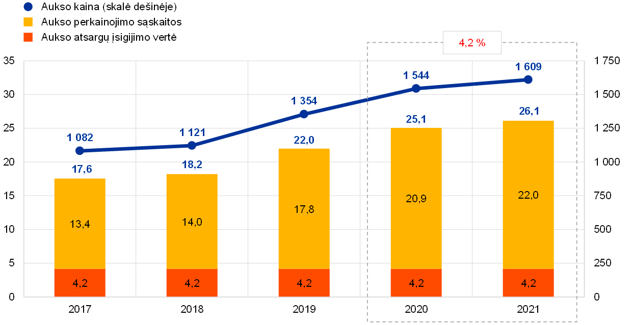 ECB turimo aukso ir gautino aukso vertė eurais 2021 m. padidėjo 1,1 mlrd. eurų – iki 26,1 mlrd. eurų (4 pav.) – dėl padidėjusios aukso rinkos kainos eurais, tačiau aukso kiekis uncijomis nepakito. Dėl šio padidėjimo atitinkama suma išaugo ir ECB aukso perkainojimo sąskaitos (žr. 1.3.2 skirsnį Finansiniai ištekliai).
