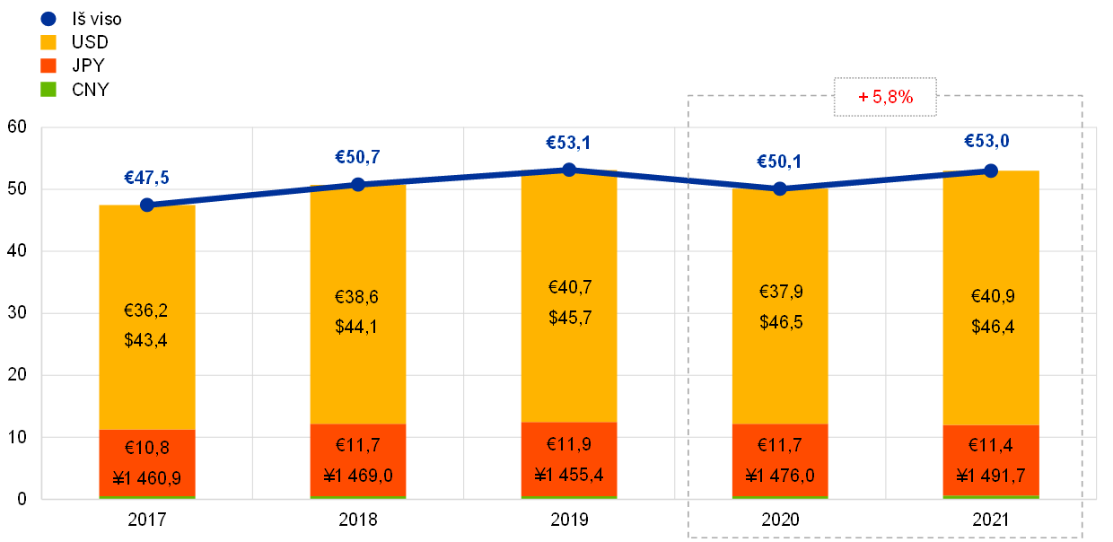 2021 m. pabaigoje JAV doleriai ir toliau sudarė didžiausią ECB užsienio valiutos atsargų dalį – apie 77 %.