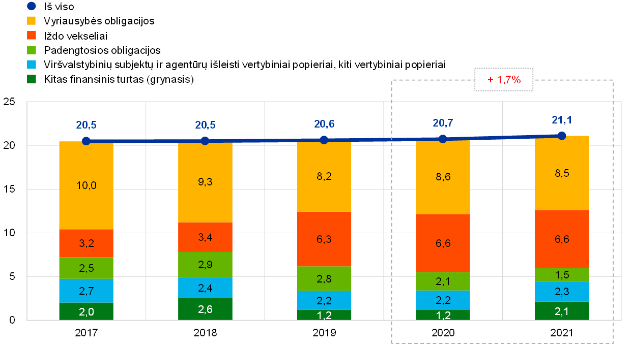 2021 m. nuosavų lėšų portfelio vertė padidėjo 0,4 mlrd. – iki 21,1 mlrd. eurų (8 pav.), daugiausia dėl 2021 m. euro zonos NCB sumokėtų sumų investavimo. Šios sumos – tai pirmoji įmoka, kuria NCB apmokėjo savo ECB pasirašytojo kapitalo dalis, padidėjusias dėl Bank of England pasitraukimo iš ECBS (žr. 1.3.2 skirsnį Finansiniai ištekliai). Šį padidėjimą iš dalies kompensavo sumažėjusi nuosavų lėšų portfelyje laikomų vertybinių popierių rinkos vertė.