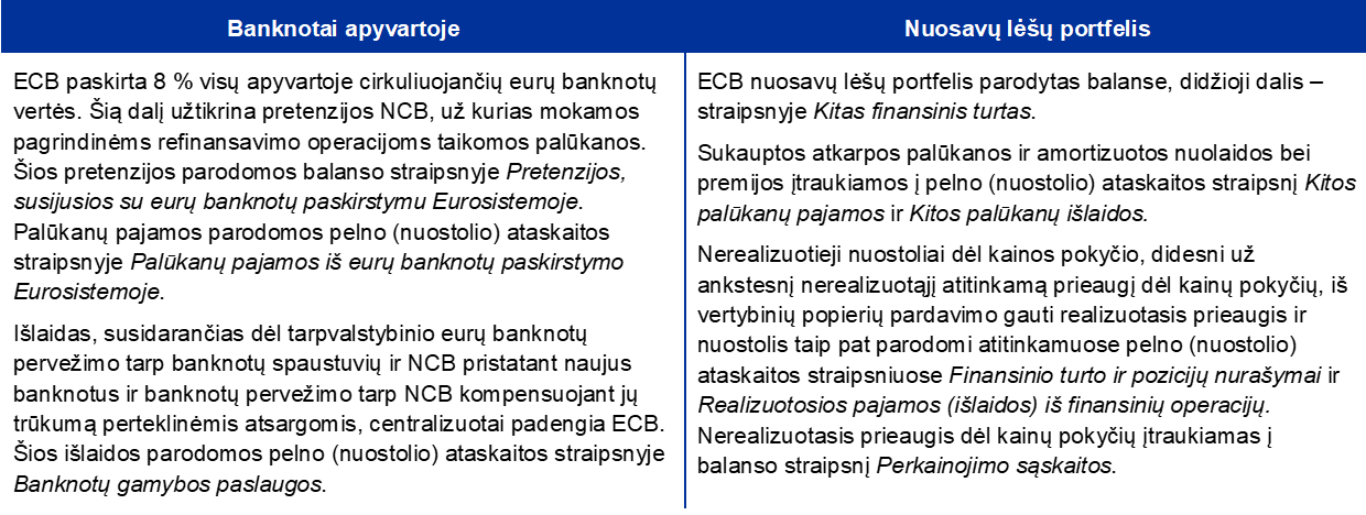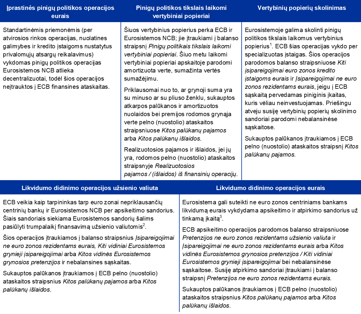 Vadovaujantis decentralizuoto pinigų politikos įgyvendinimo Eurosistemoje principu, Eurosistemos pinigų politikos operacijos yra įtrauktos į ECB ir euro zonos nacionalinių centrinių bankų finansines ataskaitas. Toliau 1 lentelėje apžvelgiamos pagrindinės operacijos ir funkcijos, kurias ECB atlieka vykdydamas savo įgaliojimus, bei jų poveikis ECB finansinėms ataskaitoms.