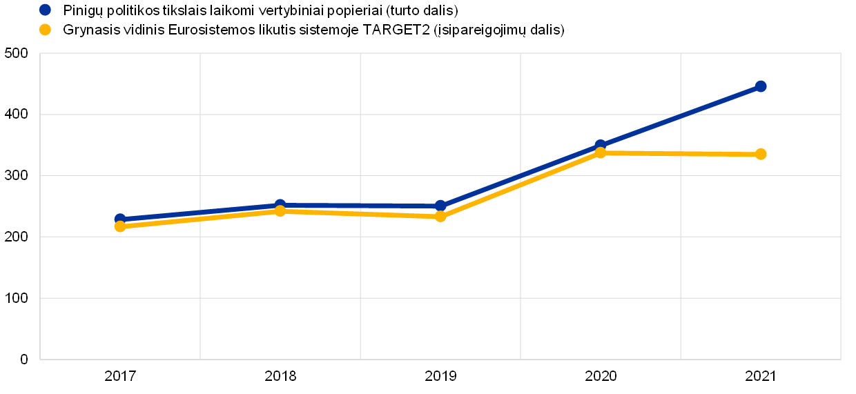 2021 m. pinigų politikos tikslais laikomų vertybinių popierių įsigijimo poveikis grynajam TARGET2 įsipareigojimui buvo su kaupu atsvertas. Tam didžiausią įtaką turėjo padidėję ne euro zonos ECB klientų TARGET2 indėliai ir ne euro zonos rezidentų indėliai, kuriuos ECB priėmė veikdamas kaip fiskalinis agentas, ir padidėjusios piniginių lėšų, gautų kaip įkaitas už vertybinių popierių skolinimo operacijas, sumos.