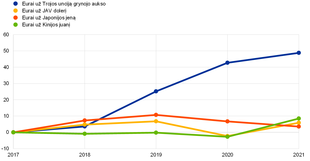 Pagrindiniai užsienio valiutos kursai ir aukso kaina 2017–2021 m.