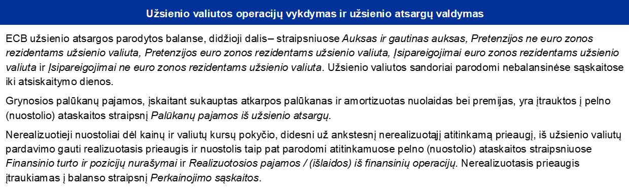 - Šias atsargas sudaro turtas, atėmus įsipareigojimus atitinkama užsienio valiuta, kuris yra užsienio valiutos perkainojimo objektas ir kuris įtrauktas į eilutes Pretenzijos ne euro zonos rezidentams užsienio valiuta, Pretenzijos euro zonos rezidentams užsienio valiuta, Sukauptos pajamos ir būsimųjų laikotarpių išlaidos, Nebalansinių priemonių perkainojimo skirtumai (įsipareigojimų dalyje) bei Sukauptos išlaidos ir būsimųjų laikotarpių pajamos, taip pat atsižvelgiant į išankstinius užsienio valiutos keitimo sandorius ir valiutų apsikeitimo sandorius užsienio valiuta, parodytus nebalansiniuose straipsniuose. Finansinių priemonių užsienio valiuta perkainojimo pajamos dėl kainos pokyčio neįtraukiamos.