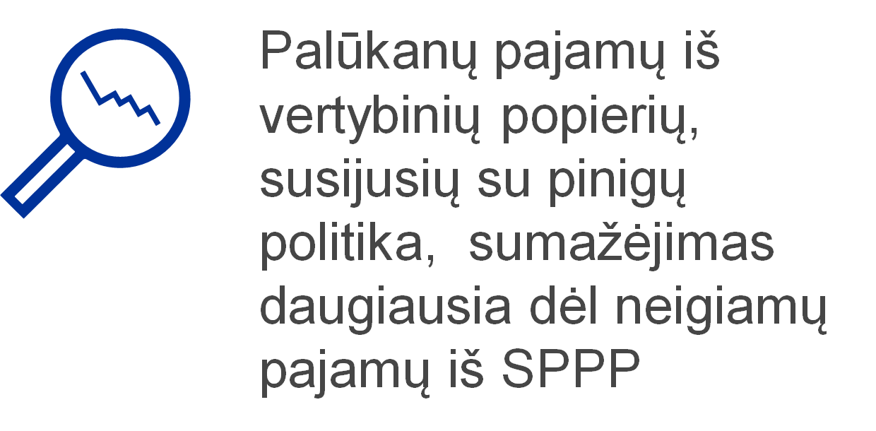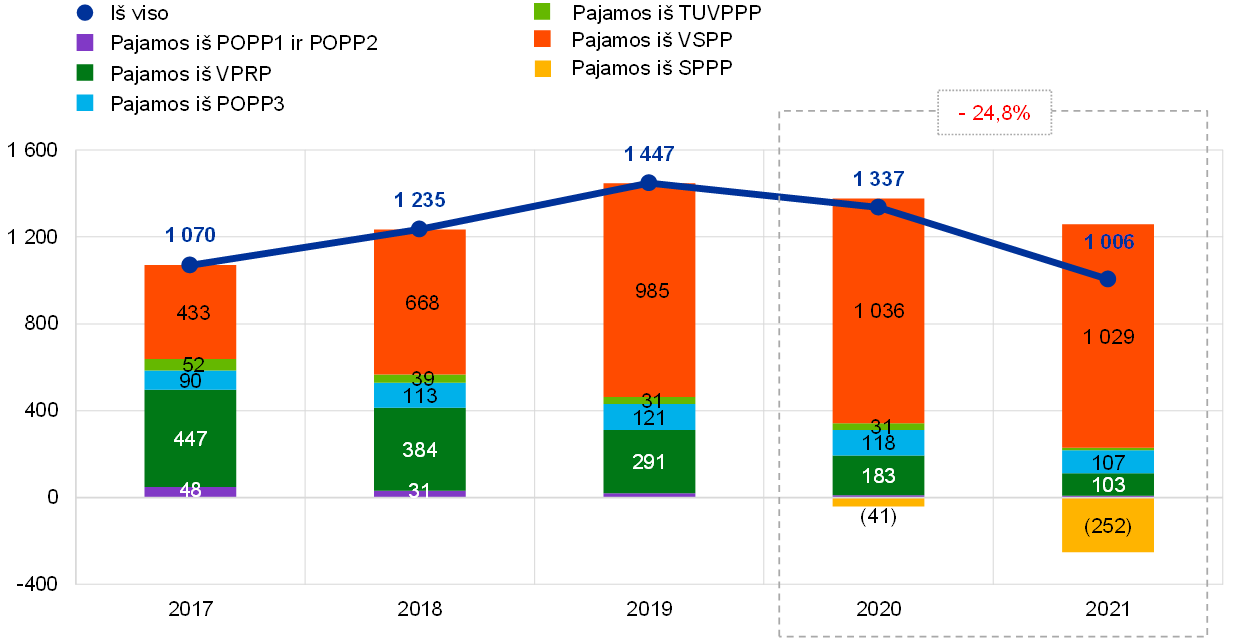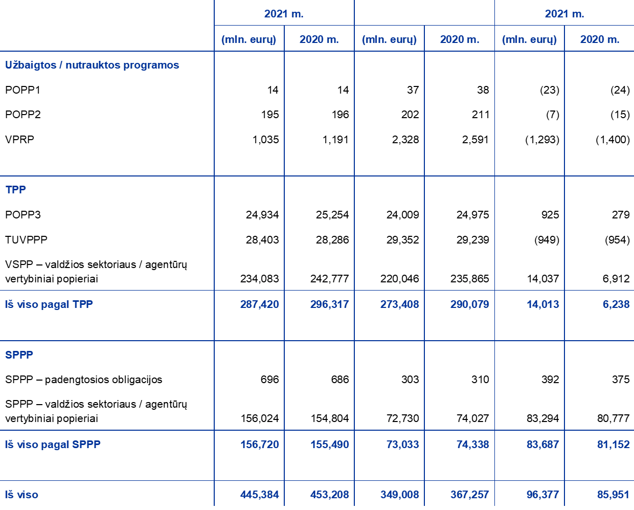 2021 m. grynosios palūkanų pajamos iš pinigų politikos tikslais laikomų vertybinių popierių sumažėjo 331 mln. eurų – iki 1 006 mln. eurų (15 pav.), daugiausia dėl neigiamų grynųjų palūkanų pajamų iš SPPP portfelio. Dėl toliau vykdomo viešojo sektoriaus vertybinių popierių pirkimo pagal SPPP (už neigiamą vidutinį pajamingumą, kurį lėmė šios programos įgyvendinimo metu vyravęs mažas euro zonos šalių vyriausybės obligacijų pajamingumas (16 pav.)), neigiamos grynosios palūkanų pajamos iš šio portfelio 2021 m. padidėjo iki 252 mln. eurų, (ankstesniais metais – 41 mln. eurų neigiamos grynosios palūkanų pajamos). Be to, grynosios palūkanų pajamos iš VPRP, POPP1 ir POPP2 portfelių smuktelėjo 82 mln. – iki 111 mln. eurų dėl to, kad, suėjus vertybinių popierių terminui, sumažėjo šių portfelių dydis. Grynosios palūkanų pajamos iš TPP (iš vertybinių popierių pagal TUVPPP, POPP3 ir VSPP) sumažėjo 37 mln. eurų – iki 1 147 mln. eurų, daugiausia dėl mažesnės vidutinės palūkanų normos, uždirbtos iš pagal TUVPPP laikomų vertybinių popierių.