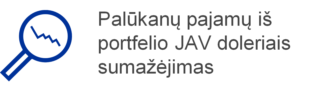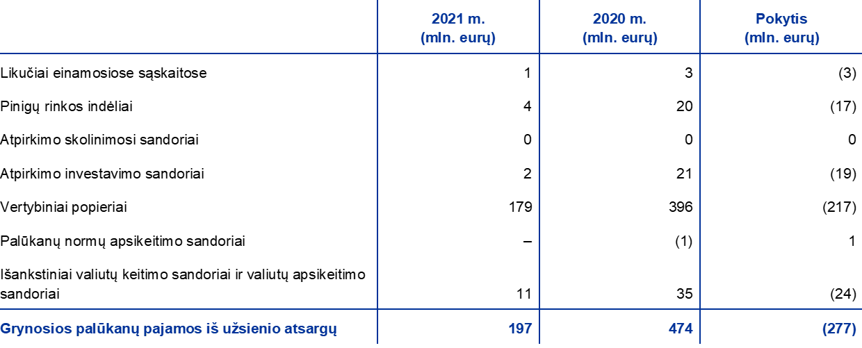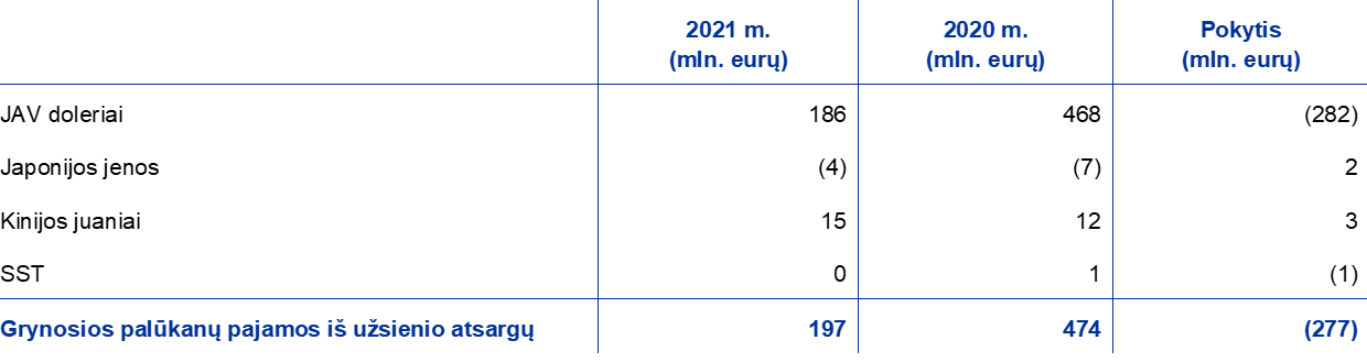 Grynosios palūkanų pajamos iš užsienio atsargų sumažėjo 277 mln. eurų – iki 197 mln. eurų, nes uždirbta mažiau palūkanų pajamų iš JAV doleriais išreikštų vertybinių popierių. Dėl beveik visus 2020 ir 2021 m. fiksuoto JAV doleriais išreikštų obligacijų mažo pajamingumo (17 pav.) ir anksčiau įsigytų didesnio pajamingumo obligacijų pardavimo bei išpirkimo, vidutinės palūkanų normos, uždirbtos iš ECB portfelio JAV doleriais, 2021 m., palyginti su ankstesniais metais, toliau mažėjo.