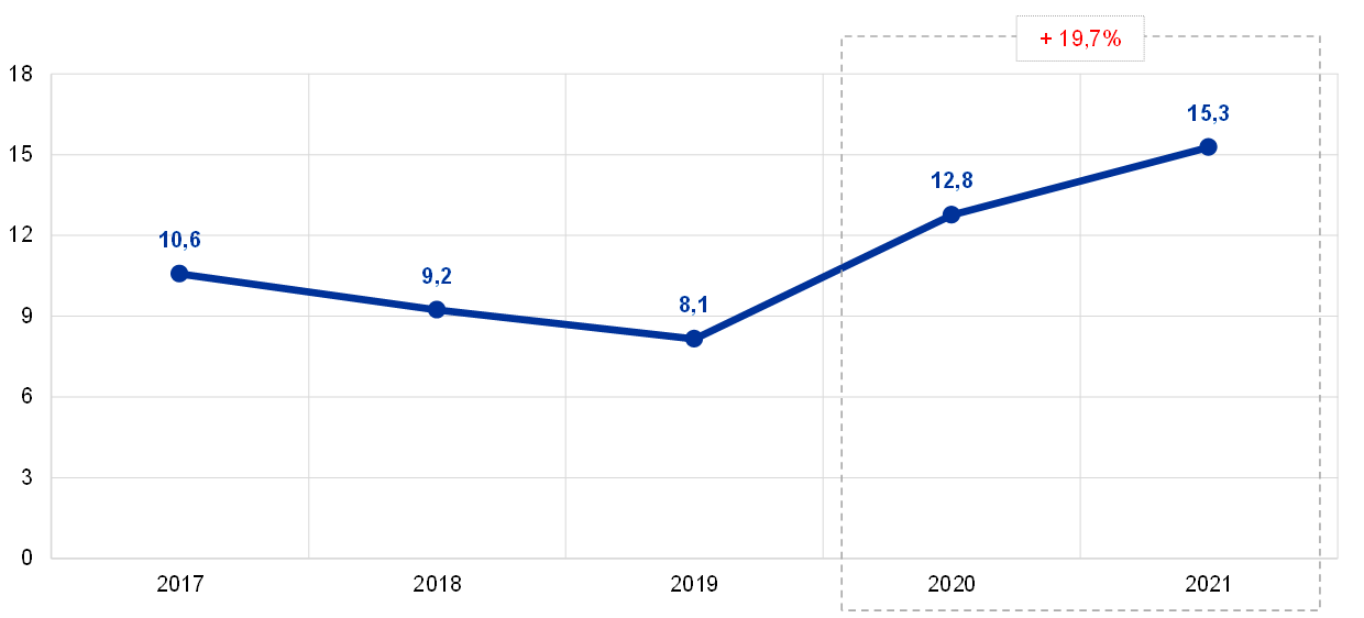 2021 m. pabaigoje, palyginti su 2020 m. pabaiga, bendra apyvartoje cirkuliuojančių eurų banknotų vertė padidėjo 8 % – iki 1 544,4 mlrd. eurų. ECB paskirta 8 % visų apyvartoje cirkuliuojančių eurų banknotų vertės. Metų pabaigoje ji sudarė 123,6 mlrd. eurų. Kadangi pats ECB neleidžia banknotų, jis turi vidinių Eurosistemos pretenzijų euro zonos NCB atžvilgiu, kurios atspindi apyvartoje cirkuliuojančių banknotų vertę.