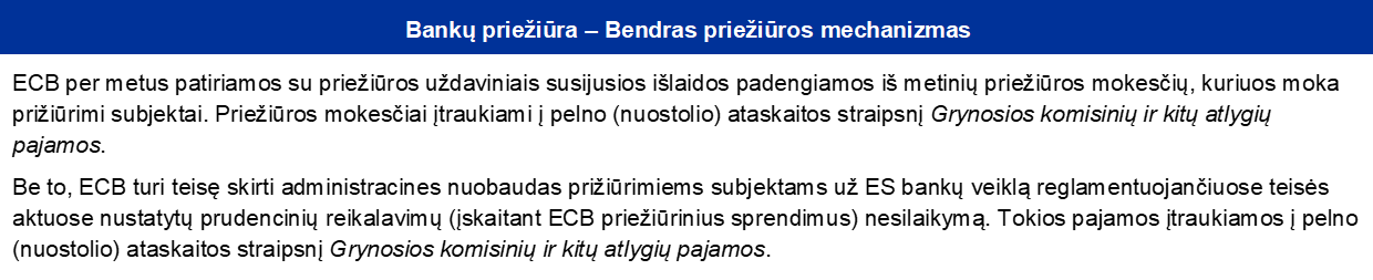 - Išlaidos, kurias ECB patiria vykdydamas priežiūros uždavinius, padengiamos iš metinių mokesčių, kuriuos moka prižiūrimi subjektai. Daugiau informacijos pateikiama ECB bankų priežiūrai skirtoje interneto svetainėje.