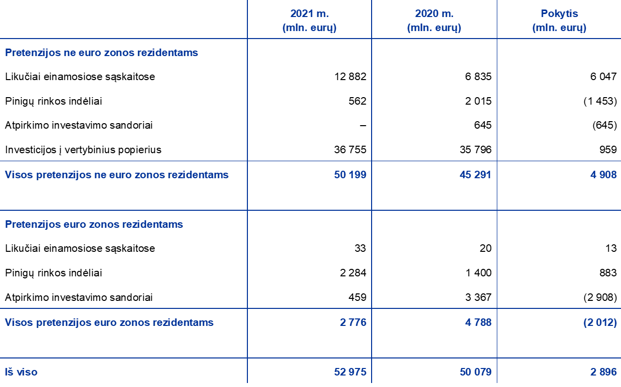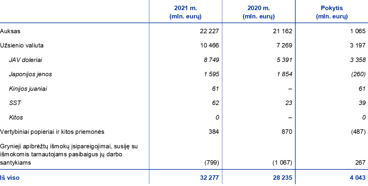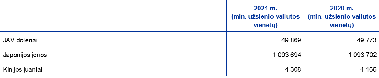 2021 m. ECB užsienio atsargų, kurias sudaro auksas, specialiosios skolinimosi teisės, JAV doleriai, Japonijos jenos ir Kinijos juaniai, bendra vertė eurais padidėjo 4,5 mlrd. eurų – iki 80,3 mlrd. eurų.