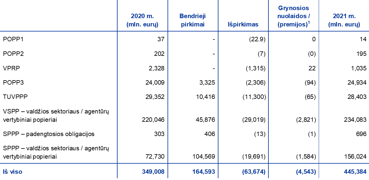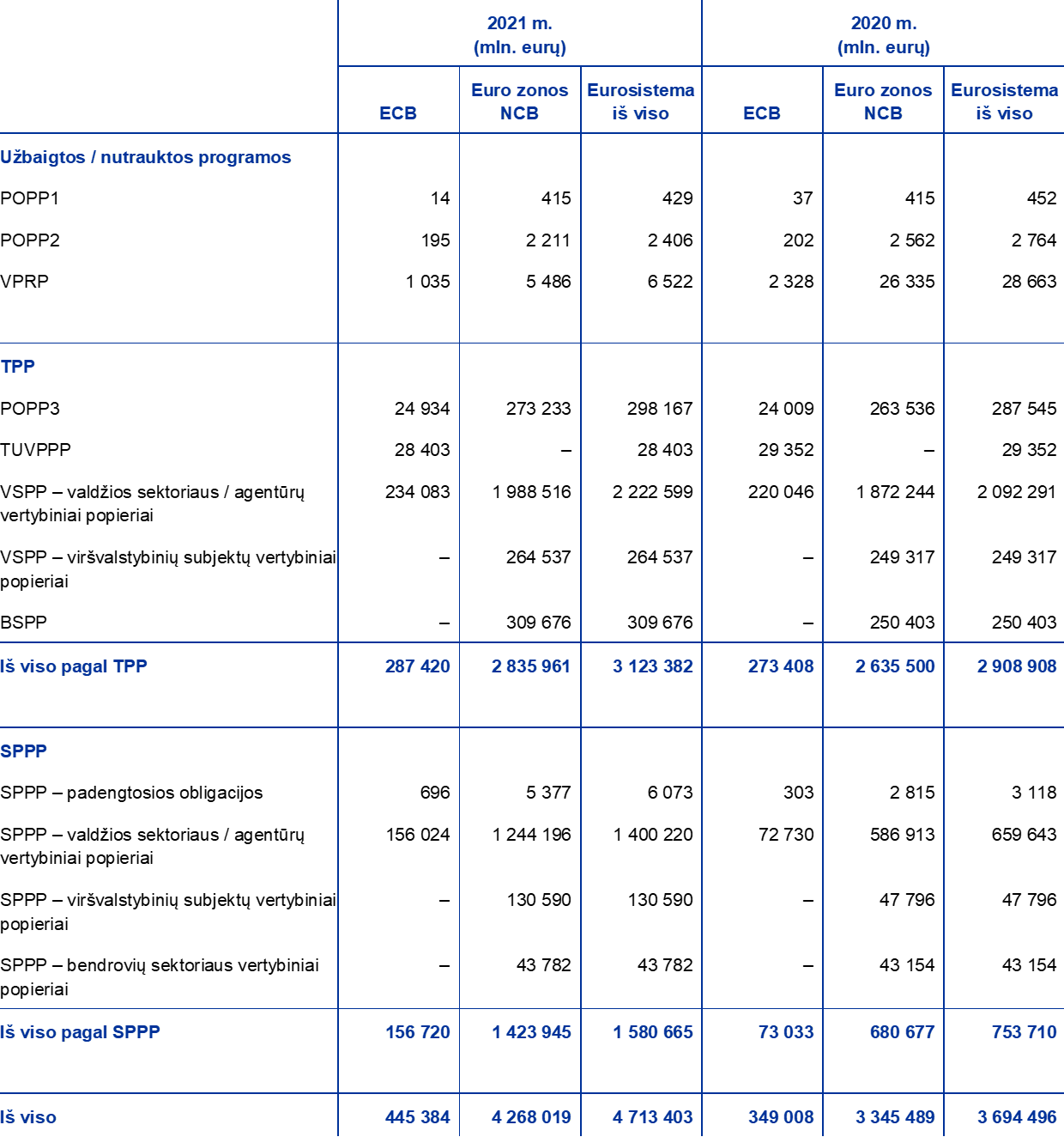 2021 m., remdamasis atitinkamais Valdančiosios tarybos sprendimais, ECB toliau vykdė grynuosius vertybinių popierių pirkimus pagal TPP ir SPPP, įskaitant pagrindinių sumų, gautų iš pagal šias programas įsigytų vertybinių popierių išpirkimo suėjus jų terminui, reinvestavimą. Dėl įvykdytų pirkimų, o daugiausia dėl pirkimų pagal SPPP, pinigų politikos tikslais ECB laikomų vertybinių popierių portfelis padidėjo 96,4 mlrd. eurų – iki 445,4 mlrd. eurų (2 pav.). Pagal VPRP, POPP1 ir POPP2 įsigytų vertybinių popierių portfelis dėl išpirkimų sumažėjo 1,3 mlrd. eurų.