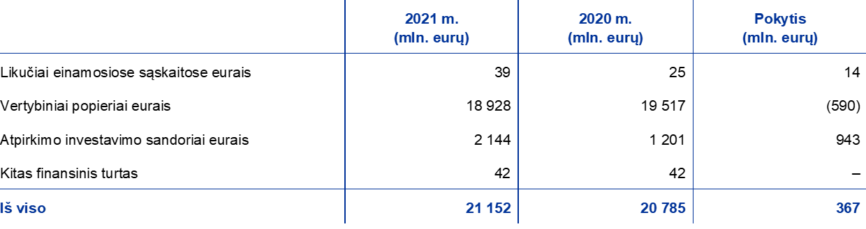 Portfelį daugiausia sudaro vertybiniai popieriai, išreikšti eurais. Šie vertybiniai popieriai vertinami metų pabaigoje buvusia rinkos kaina. 2021 m. valdžios sektoriaus skolos vertybiniai popieriai sudarė 72 % viso portfelio.
