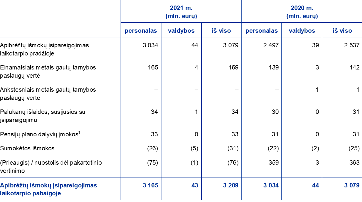 - Plano apibrėžtų išmokų dalyje yra rodomos tik ECB ir jo tarnautojų privalomosios įmokos. 2021 m. tarnautojai sumokėjo 220 mln. eurų (2020 m. – 186 mln. eurų) savanoriškų įmokų į apibrėžtų įmokų planą. Šios įmokos investuojamos į pensijų plano turtą, kartu ta pačia suma didėja ir įsipareigojimai.