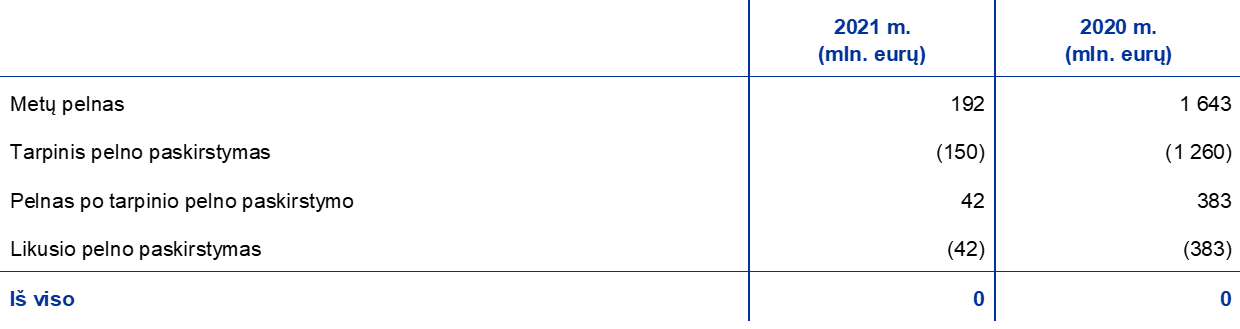 2021 m. ECB grynasis pelnas sudarė 192 mln. eurų. Valdančiosios tarybos sprendimu, 2022 m. sausio 31 d. atliktas tarpinis pelno paskirstymas (150 mln. eurų) euro zonos NCB. Be to, Valdančioji taryba nusprendė euro zonos NCB paskirstyti ir likusią pelno dalį (42 mln. eurų).