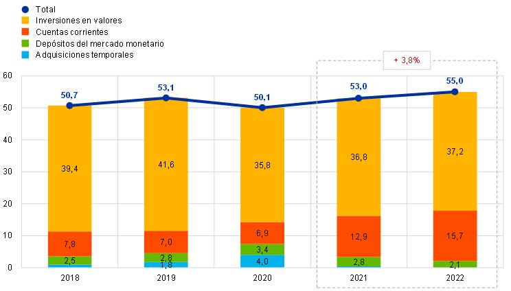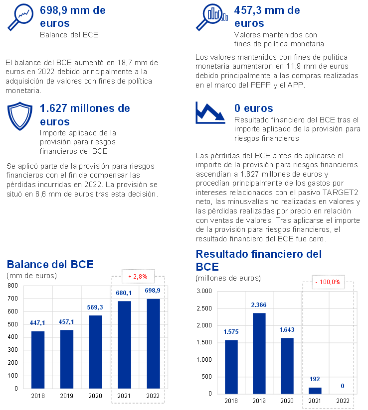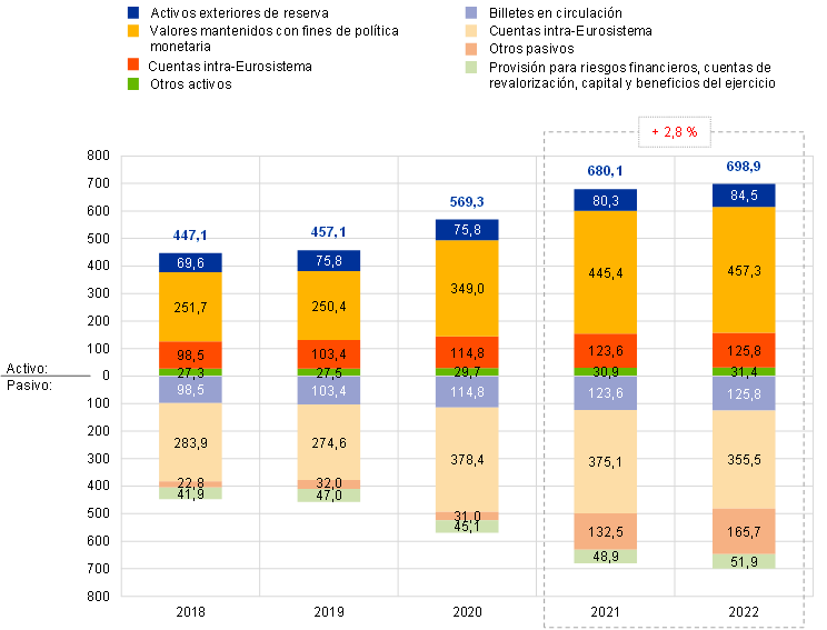 En 2022, el balance del BCE aumentó en 18,7 mm, situándose en 698,9 mm de euros, debido principalmente a la participación del BCE en las compras de valores en el marco del PEPP y del APP. Estas compras se tradujeron en un incremento de los valores mantenidos con fines de política monetaria, mientras que su liquidación en efectivo en cuentas TARGET2 dio lugar al consiguiente aumento de los pasivos intra-Eurosistema. Este aumento de los pasivos intra-Eurosistema fue compensado con creces por las entradas de efectivo resultantes del incremento de los depósitos en el BCE de residentes en la zona del euro, lo que simultáneamente dio lugar a un aumento de otros pasivos.