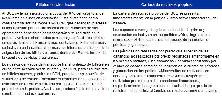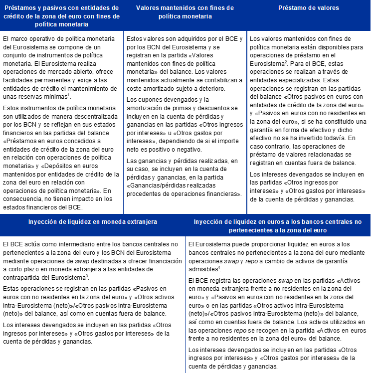 Las operaciones de política monetaria del Eurosistema se registran en los estados financieros del BCE y de los BCN de la zona del euro, conforme al principio de ejecución descentralizada de la política monetaria en el Eurosistema. El cuadro 1 presenta un esquema de las principales operaciones y funciones que realiza el BCE en cumplimiento de su mandato, y su impacto en los estados financieros del BCE.