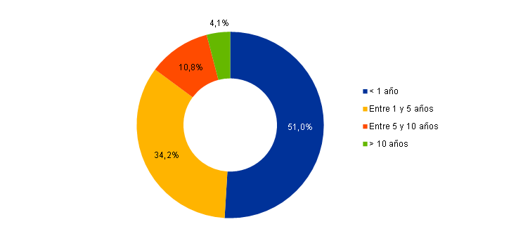 La cartera de recursos propios del BCE se compone principalmente de las inversiones de los recursos financieros del BCE, a saber, su capital desembolsado y los importes mantenidos en el fondo de reserva general y en la provisión para riesgos financieros. El objeto de esta cartera es proporcionar al BCE los ingresos necesarios para ayudarle a hacer frente a gastos de explotación no relacionados con el desempeño de sus tareas de supervisión[12]. La cartera se invierte en activos denominados en euros dentro de los límites que impone su marco de control de riesgos, lo que da lugar a una estructura de vencimientos más diversificada (véase gráfico 9) que en la cartera de reservas exteriores.
