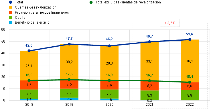 Los recursos financieros del BCE se componen de su capital, los importes mantenidos en la provisión para riesgos financieros y el fondo de reserva general, las cuentas de revalorización y los beneficios del ejercicio. Estos recursos financieros: i) se invierten en activos que generan ingresos, y/o ii) se utilizan para compensar pérdidas. A 31 de diciembre de 2022, los recursos financieros del BCE ascendían a un total de 51,6 mm de euros (véase gráfico 11). Esta cifra es 1,8 mm de euros mayor que en 2021 debido: i) al aumento de las cuentas de revalorización tras la apreciación del dólar estadounidense frente al euro y la subida del precio de mercado en euros del oro en 2022; y ii) al aumento del capital desembolsado. Estos aumentos se vieron compensados en cierta medida, principalmente por la reducción en la provisión para riesgos financieros, que se utilizó en parte para compensar las pérdidas incurridas en 2022.