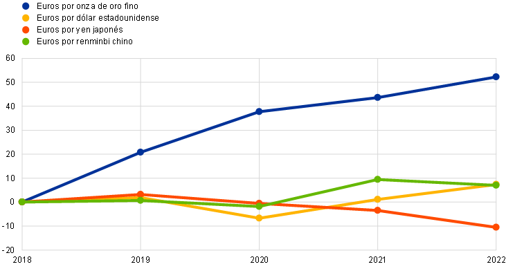 El dólar estadounidense continuó siendo el principal componente de la cartera de reservas exteriores del BCE, suponiendo aproximadamente el 78 % de dicha cartera a final de 2022.