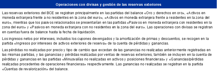 Estas tenencias incluyen activos netos, denominados en la respectiva moneda extranjera, sujetos a revalorización por tipo de cambio, que figuran en las partidas «Activos en moneda extranjera frente a no residentes en la zona del euro», «Activos en moneda extranjera frente a residentes en la zona del euro», «Cuentas de periodificación del activo y gastos anticipados», «Diferencias por valoración de partidas fuera de balance» (lado del pasivo) y «Cuentas de periodificación del pasivo e ingresos percibidos por adelantado», y tienen en cuenta las operaciones a plazo en divisas y los swaps de divisas registrados en partidas fuera de balance. No se incluyen los efectos de las revalorizaciones de los precios de los instrumentos financieros denominados en moneda extranjera.