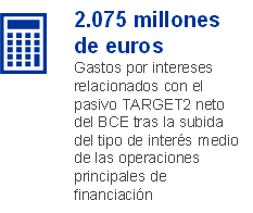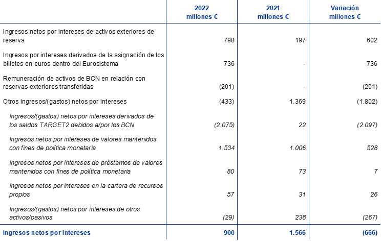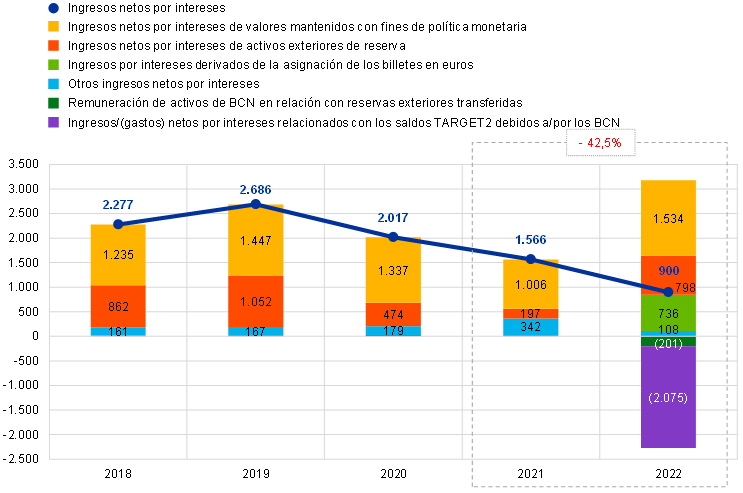 Los ingresos netos por intereses del BCE disminuyeron en 666 millones, situándose en 900 millones de euros (véase gráfico 14), debido principalmente a los gastos por intereses relacionados con el pasivo TARGET2 neto del BCE. Los gastos por intereses derivados de la remuneración de los activos de los BCN de la zona del euro en relación con las reservas exteriores transferidas al BCE también contribuyeron a esta disminución. Estos gastos fueron compensados en parte por los mayores ingresos por intereses procedentes de: i) activos del BCE relacionados con la asignación de billetes en euros en el Eurosistema; ii) activos exteriores de reserva; y iii) valores mantenidos con fines de política monetaria.