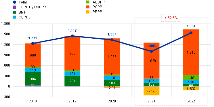 Sobre la base de decisiones pertinentes del Consejo de Gobierno, el BCE continuó sus compras netas de valores en el marco del PEPP hasta final de marzo de 2022, mientras que las compras netas en el marco del APP concluyeron el 1 de julio de 2022. Al mismo tiempo, siguió reinvirtiéndose íntegramente durante el año el principal de los valores mantenidos en ambas carteras que iban venciendo. Como resultado de estas compras y reinversiones, la cartera de valores mantenidos por el BCE con fines de política monetaria aumentó en 11,9 mm, situándose en 457,3 mm de euros (véase gráfico 2), y las tenencias en el marco del PEPP y del PSPP aumentaron en 9,0 mm y 8,8 mm de euros, respectivamente. La disminución de 5,5 mm de euros en las tenencias del ABSPP se debió a amortizaciones.