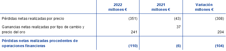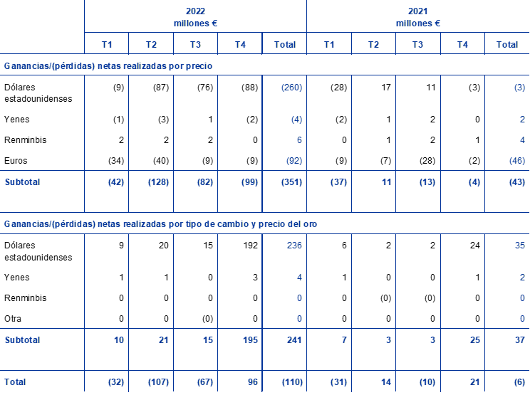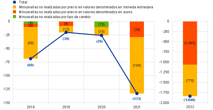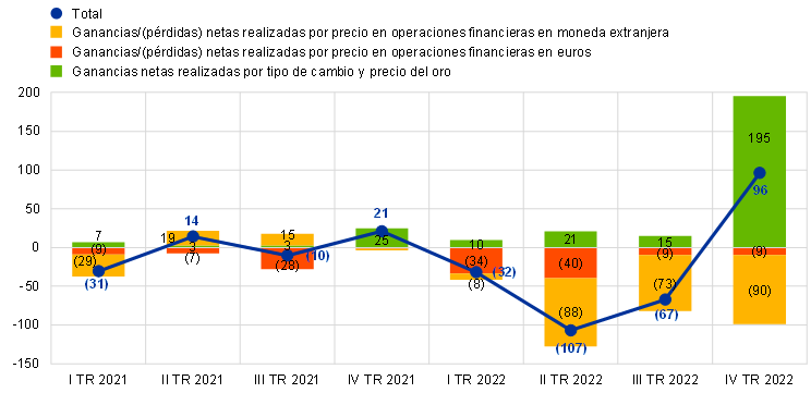 Las ganancias no realizadas en oro y divisas y las ganancias no realizadas en valores sujetos a revalorización no se registran como ingresos en la cuenta de pérdidas y ganancias, sino que se traspasan directamente a cuentas de revalorización en el pasivo del balance. Los saldos de estas cuentas podrán utilizarse para absorber el impacto de futuros movimientos desfavorables de los precios y/o tipos de cambio respectivos, lo que fortalecerá la capacidad del BCE para hacer frente a los riesgos subyacentes. En 2022, las cuentas de revalorización del oro, las divisas y los valores[14] aumentaron en 3,0 mm, situándose en 36,1 mm de euros, debido al incremento de los saldos de las cuentas de revalorización de las divisas y el oro, como consecuencia de la apreciación del dólar estadounidense frente al euro y de la subida del precio de mercado en euros de ese metal (véase gráfico 12), que se vieron parcialmente compensadas por el descenso de los saldos de las cuentas de revalorización de los valores.