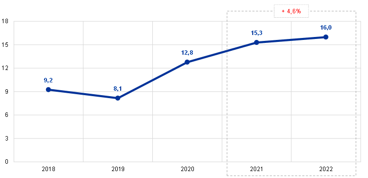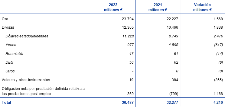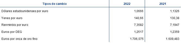 En 2022, el valor total equivalente en euros de los activos exteriores de reserva del BCE, formados por tenencias de oro, derechos especiales de giro, dólares estadounidenses, yenes japoneses y renminbis chinos, aumentó en 4,1 mm, situándose en 84,5 mm de euros.