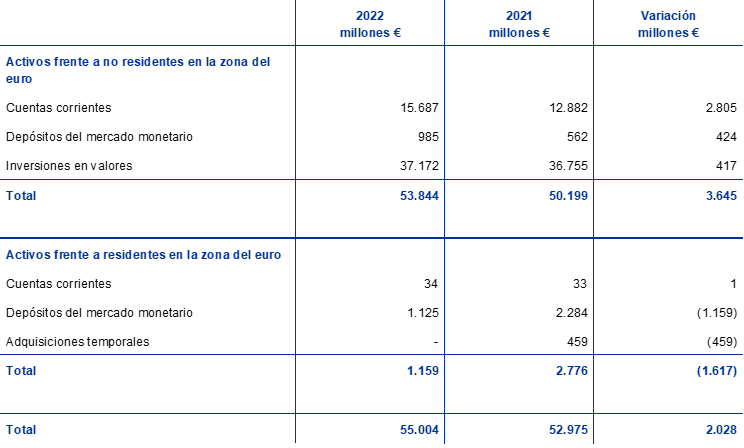 Estas tenencias comprenden los activos incluidos en las partidas del balance «Activos en moneda extranjera frente a no residentes en la zona del euro — Depósitos en bancos, inversiones en valores, préstamos al exterior y otros activos exteriores» y «Activos en moneda extranjera frente a residentes en la zona del euro».