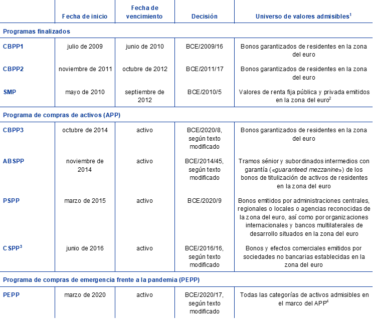 El APP incluye el tercer programa de adquisiciones de bonos garantizados (CBPP3), el programa de compras de bonos de titulización de activos (ABSPP), el programa de compras de valores públicos (PSPP) y el programa de compras de bonos corporativos (CSPP). El BCE no adquiere valores en el marco del CSPP. Puede consultarse información más detallada sobre el APP en el sitio web del BCE.
