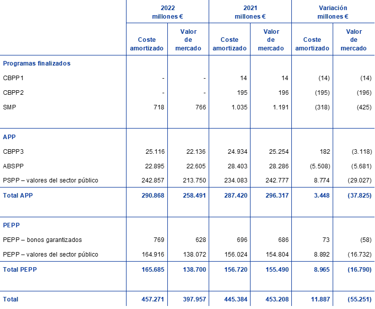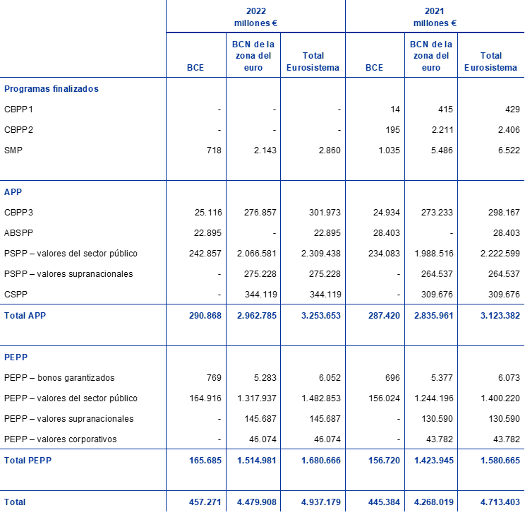 Los valores denominados en euros mantenidos con fines de política monetaria suponían el 65 % de los activos totales del BCE a final de 2022. El BCE mantiene en esta partida los activos adquiridos en el contexto del programa para los mercados de valores (SMP), el CBPP3, el ABSPP, el PSPP y el PEPP. El resto de activos mantenidos en el marco de los programas primero y segundo de adquisiciones de bonos garantizados (CBPP1 y CBPP2) vencieron durante 2022.