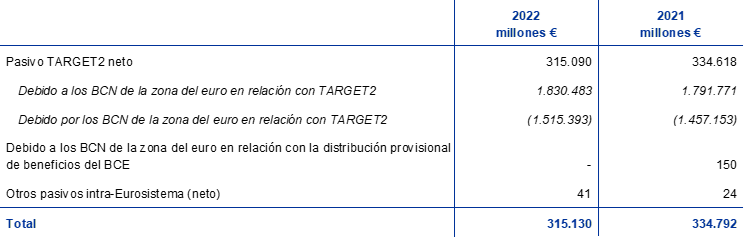 Los pasivos intra-Eurosistema del BCE, que comprenden fundamentalmente los saldos TARGET2 netos de los BCN de la zona del euro frente al BCE y los pasivos del BCE relacionados con las reservas en moneda extranjera que los BCN de la zona del euro le transfirieron en el momento de su incorporación al Eurosistema, se redujeron en 19,7 mm, situándose en 355,5 mm de euros en 2022.