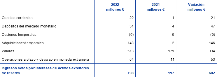 Los ingresos netos por intereses de activos exteriores de reserva aumentaron en 602 millones, situándose en 798 millones de euros, como resultado principalmente de los mayores ingresos por intereses obtenidos de los valores denominados en dólares estadounidenses. El tipo de interés medio obtenido en la cartera en dólares estadounidenses del BCE se incrementó en 2022 en comparación con el año anterior debido a: i) las ventas y amortizaciones de bonos con menores rendimientos adquiridos en el pasado; y ii) las compras de valores con rendimientos más elevados como consecuencia del aumento de los rendimientos de los bonos en dólares estadounidenses desde final de 2021 (véase gráfico 17).
