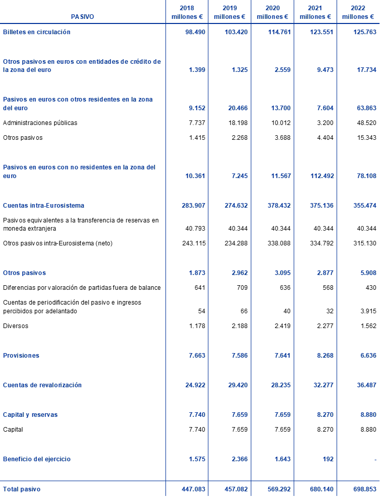 Nota: a fin de garantizar la comparabilidad, los importes que se muestran en las subpartidas «Administraciones públicas» y «Otros pasivos» de la partida «Pasivos en euros con otros residentes en la zona del euro» se han ajustado para 2018 y 2019 de conformidad con el enfoque aplicado desde 2020. Puede consultarse información más detallada sobre este cambio en «Reclasificaciones» del apartado 2.3 «Normativa contable» de las Cuentas Anuales del BCE de 2020.