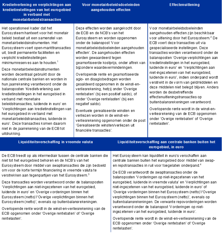 Binnen het Eurosysteem wordt het monetair beleid in beginsel decentraal ten uitvoer gelegd. Dit impliceert dat de monetairbeleidstransacties van het Eurosysteem in de jaarrekening van de ECB en die van de NCB’s van het eurogebied worden verantwoord. Tabel 1 bevat een overzicht van de belangrijkste transacties en functies van de ECB die voortvloeien uit haar mandaat, en de invloed daarvan op de jaarrekening van de ECB.