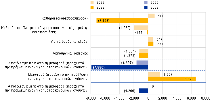 Η ζημία της ΕΚΤ για το 2023, μετά την αποδέσμευση του πλήρους ποσού της πρόβλεψης έναντι χρηματοοικονομικών κινδύνων, διαμορφώθηκε σε 1.266 εκατ. ευρώ (2022: μηδενική ζημία). Κατόπιν απόφασης του Διοικητικού Συμβουλίου, η ζημία αυτή θα καταγραφεί στον ισολογισμό της ΕΚΤ και θα συμψηφιστεί με μελλοντικά κέρδη.