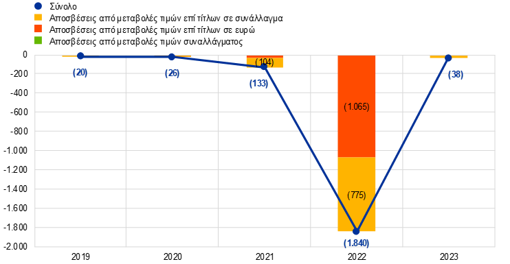 Με βάση τις σχετικές αποφάσεις του Διοικητικού Συμβουλίου, το Ευρωσύστημα συνέχισε να επανεπενδύει, πλήρως, τα ποσά κεφαλαίου από την εξόφληση τίτλων στο πλαίσιο του προγράμματος PEPP κατά τη λήξη τους καθ’ όλη τη διάρκεια του έτους και στο πλαίσιο του προγράμματος APP μέχρι το τέλος Φεβρουαρίου 2023. Από τις αρχές Μαρτίου μέχρι το τέλος Ιουνίου του 2023, το Ευρωσύστημα επανεπένδυσε μόνο μερικώς τα ποσά κεφαλαίου από την εξόφληση τίτλων στο πλαίσιο του προγράμματος APP κατά τη λήξη τους και από τον Ιούλιο του 2023 τερμάτισε αυτές τις επανεπενδύσεις. Ως αποτέλεσμα αυτών των αποφάσεων, το χαρτοφυλάκιο τίτλων που διακρατεί η ΕΚΤ για σκοπούς νομισματικής πολιτικής μειώθηκε κατά 31,9 δισεκ. ευρώ σε 425,3 δισεκ. ευρώ (Διάγραμμα 2), καθώς μειώθηκαν οι τίτλοι που διακρατούνται στο πλαίσιο των προγραμμάτων PSPP, ABSPP και CBPP3 εντός του προγράμματος APP κατά 18,0 δισεκ. ευρώ, 9,5 δισεκ. ευρώ και 1,6 δισεκ. ευρώ αντίστοιχα λόγω εξοφλήσεων. Το χαρτοφυλάκιο PEPP μειώθηκε κατά 2,6 δισεκ. ευρώ, κυρίως λόγω της καθαρής επίδρασης από την απόσβεση των διαφορών υπέρ και υπό το άρτιο[8] των τίτλων που διακρατούνται στο χαρτοφυλάκιο.
