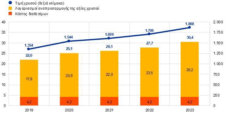 Το ισότιμο σε ευρώ της αξίας των διαθεσίμων της ΕΚΤ σε χρυσό και απαιτήσεις σε χρυσό αυξήθηκε κατά 2,7 δισεκ. ευρώ σε 30,4 δισεκ. ευρώ το 2023 (Διάγραμμα 4), λόγω, κυρίως, της ανόδου της αγοραίας τιμής του χρυσού σε όρους ευρώ. Αυτή η άνοδος οδήγησε επίσης σε ισόποση αύξηση των λογαριασμών αναπροσαρμογής της αξίας χρυσού της ΕΚΤ (βλ. Ενότητα 1.3.2 "Καθαρή θέση"). Επιπροσθέτως, όταν η Κροατία υιοθέτησε το ενιαίο νόμισμα με ισχύ από 1.1.2023, η Hrvatska narodna banka μεταβίβασε στην ΕΚΤ χρυσό αξίας 96 εκατ. ευρώ.