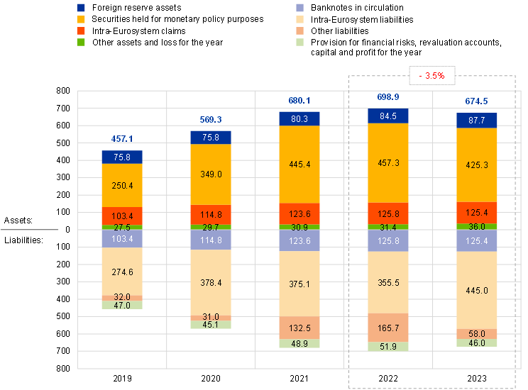 In 2023 the ECB’s balance sheet decreased by €24.4 billion to €674.5 billion, mainly owing to the gradual decline of APP holdings as a result of the only partial reinvestment of principal payments from maturing securities in this portfolio between March and June 2023 and the complete discontinuation of such reinvestments as of July 2023.