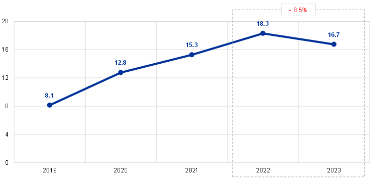 At the end of 2023 the total value of euro banknotes in circulation was €1,567.7 billion, virtually the same as at the end of 2022. The ECB has been allocated an 8% share of the total value of euro banknotes in circulation, which amounted to €125.4 billion at the end of the year. Since the ECB does not issue banknotes itself, it holds intra-Eurosystem claims vis-à-vis the euro area NCBs for a value equivalent to the value of the banknotes in circulation allocated to it.