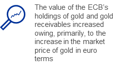 The euro equivalent value of the ECB’s holdings of gold and gold receivables increased by €2.7 billion to €30.4 billion in 2023 (Chart 4) owing, primarily, to an increase in the market price of gold in euro terms. This increase also led to an equivalent rise in the ECB’s gold revaluation accounts (see Section 1.3.2 “Net equity”). In addition, upon the adoption of the single currency by Croatia with effect from 1 January 2023, Hrvatska narodna banka transferred to the ECB gold with a value of €96 million.