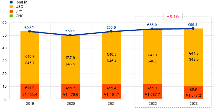 Tháinig méadú €0.2 billiún go €55.2 billiún (Cairt 5) ar shealúchais airgeadra eachtraigh[11] BCE de dhollair na Stát Aontaithe, yen na Seapáine agus renminbi na Síne, go príomha de thairbhe an ioncaim a tuilleadh i rith na bliana, ar phunann dhollar na Stát Aontaithe den chuid is mó. De bhreis air sin, nuair a ghlac an Chróit an t-airgeadra aonair le héifeacht ón 1 Eanáir 2023, d’aistrigh Hrvatska narodna banka sócmhainní cúlchistí eachtracha a ainmnítear i ndollair na Stát Aontaithe dar luach €544 mhilliún chuig BCE. An méadú ar luach iomlán na sealúchas airgeadra eachtraigh, fritháiríodh é go páirteach i ngeall ar dhímheas dhollar na Stát Aontaithe agus yen na Seapáine in aghaidh an euro den chuid is mó.