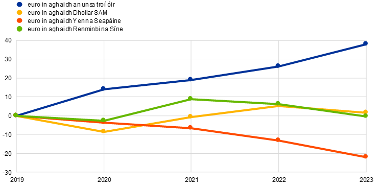Tháinig méadú €2.7 billiún go €30.4 billiún ar luach coibhéiseach euro shealúchais óir agus infháltais óir BCE in 2023 (Cairt 4) i ngeall, go príomha, ar mhéadú ar phraghas margaidh an óir i dtéarmaí euro. De bharr an ardaithe seo freisin bhí ardú coibhéiseach i gcuntais athluachála óir BCE (féach Roinn 1.3.2 “Glanchothromas”). De bhreis air sin, nuair a ghlac an Chróit an t‑airgeadra aonair le héifeacht ón 1 Eanáir 2023, d’aistrigh Hrvatska narodna banka ór dar luach €96 mhilliún chuig BCE.
